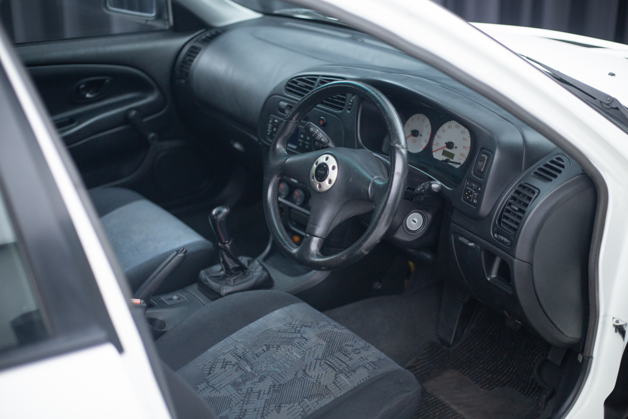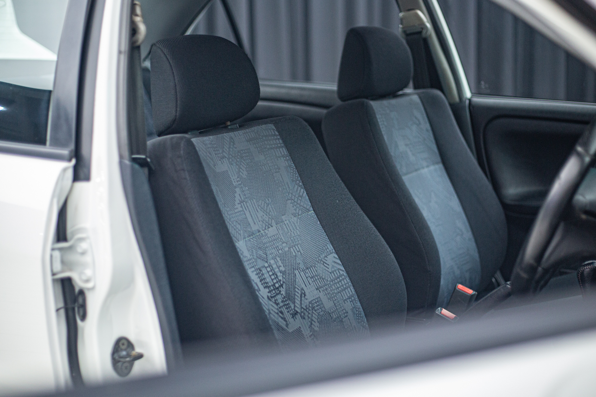 Interior: Dark charcoal fabric upholstery with factory geometric pattern